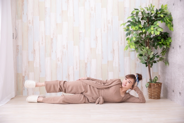 サイドレッグレイズ...「腹斜筋」1.横向きになり肘をついておく